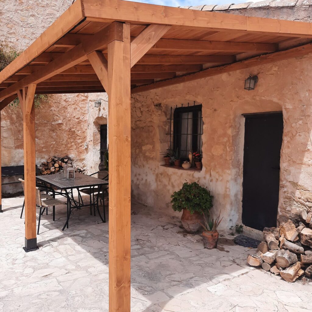 La madera maciza es ideal para quienes buscan una pérgola con presencia y carácter natural. Utilizamos postes de 7×7 y 9×9 cm, perfectamente escuadrados, que ofrecen una estética rústica y firme. Esta opción es perfecta para jardines clásicos, zonas de barbacoa o patios familiares donde se desea un aspecto cálido y auténtico sin perder estabilidad.
